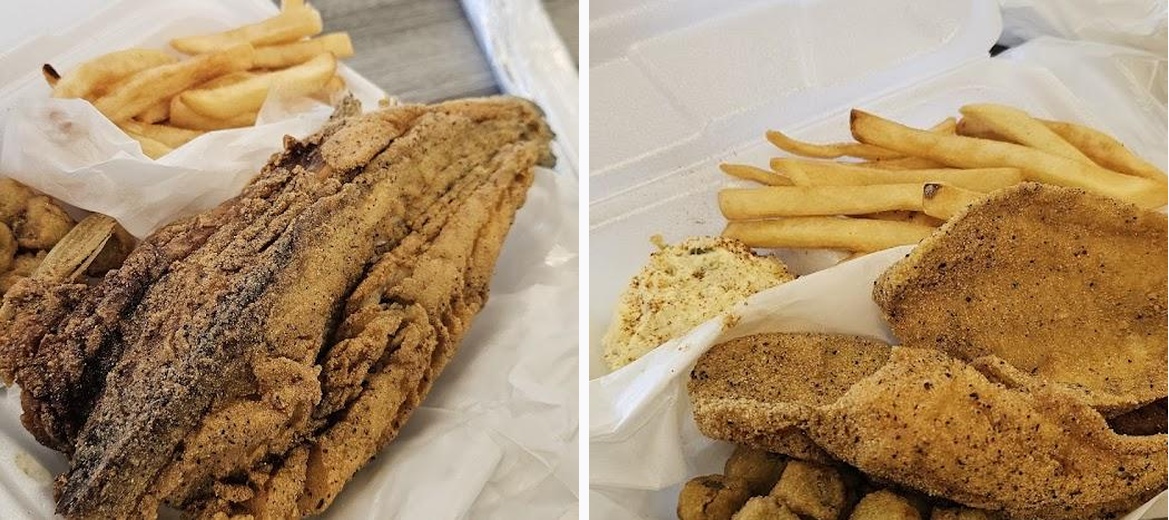 Definitely try the fried seafood, particularly the flounder and hush puppies, which are highly praised. The potato salad and baked beans complement the dishes well. Don’t miss out on the cheesecake for dessert!